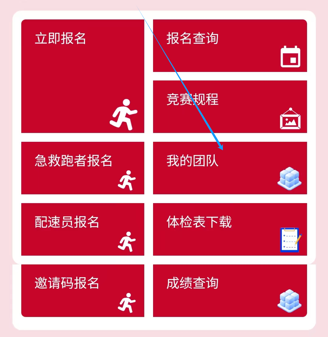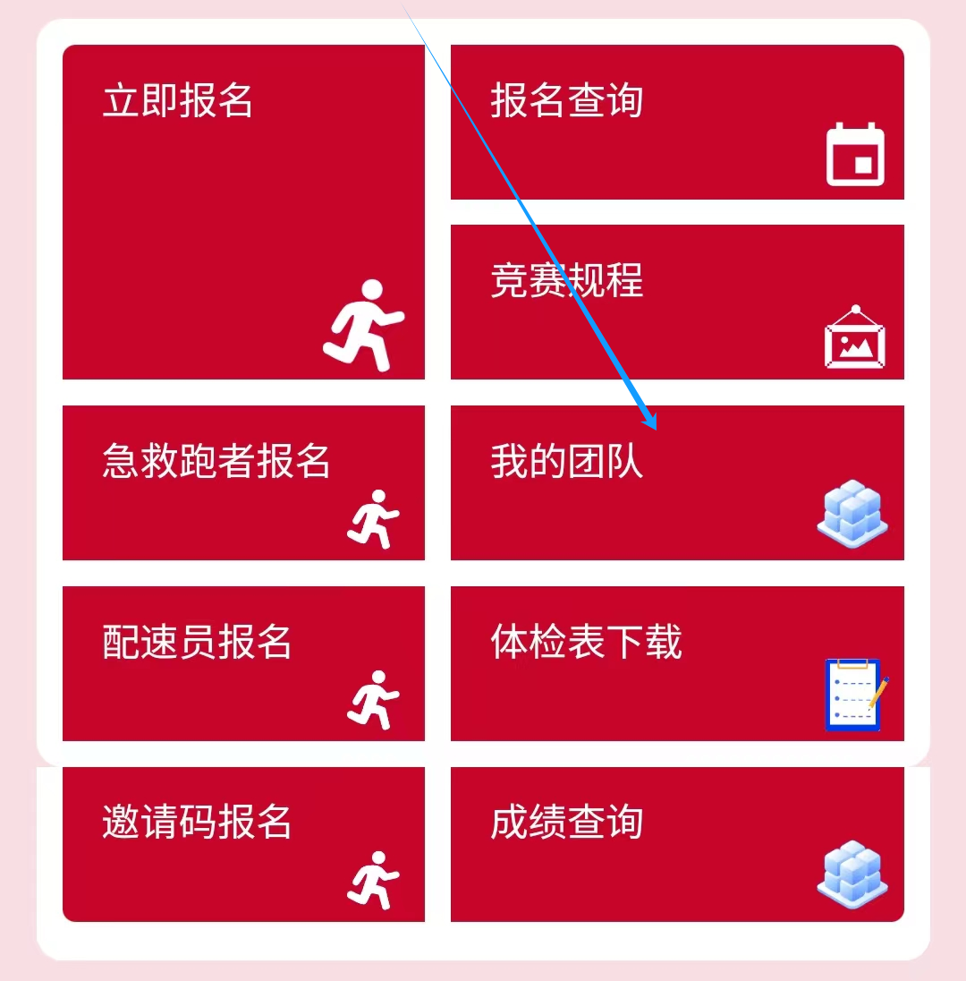 打开小程序点击 “立即报名”,依次阅读《报名须知》、《参赛声明》、《反兴奋剂知识普及与安全用药提醒》,完成后选择“跑团”。